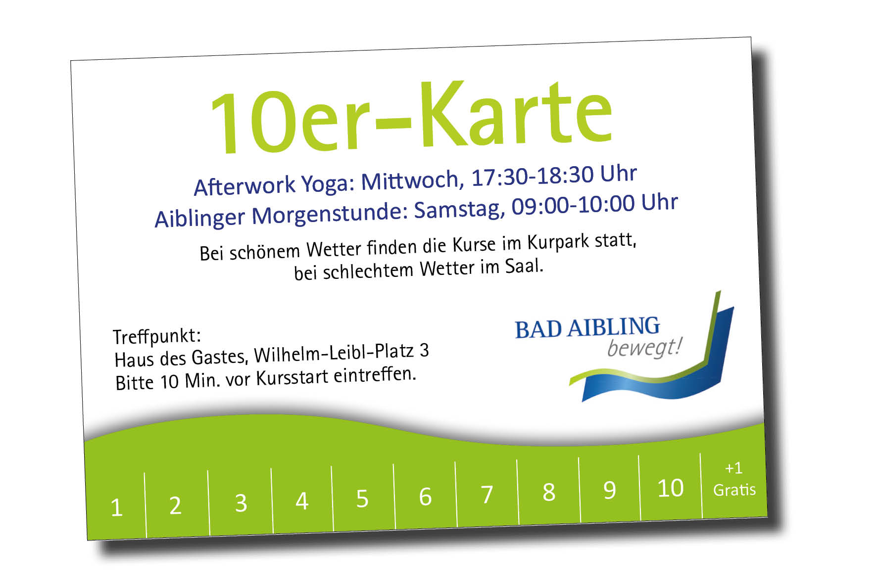 Ihre Bad Aibling bewegt 10er Kurskarte können Sie für die Afterwork-Yoga Kurse sowie für die Aiblinger Morgenstunden verwenden. Die Kurskarte ist übertragbar und 12 Monate gültig.
